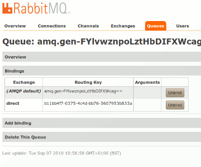 The previously mentioned management plugin is now in a state where it's worth looking at and testing. In order to make this easy, I've made a special once-only binary release just for the management plugin (in future we'll make binary releases of it just like the other plugins). Download all the .ez files from here and install them as described here, then let us know what you think. (Update 2010-09-22: Note that the plugins referenced in this blog post are for version 2.0.0 of RabbitMQ. We've now released 2.1.0 - for this and subsequent versions you can get the management plugin from here).